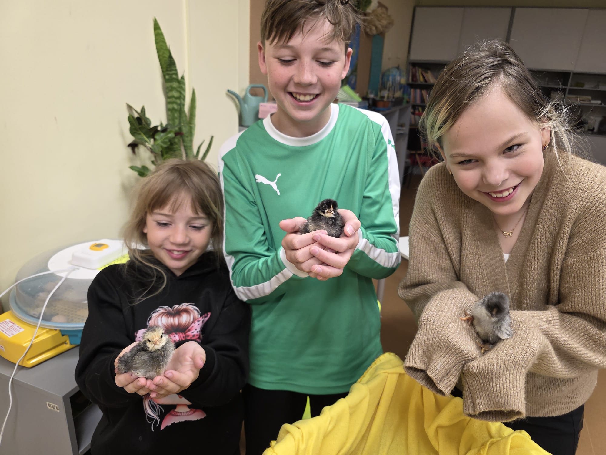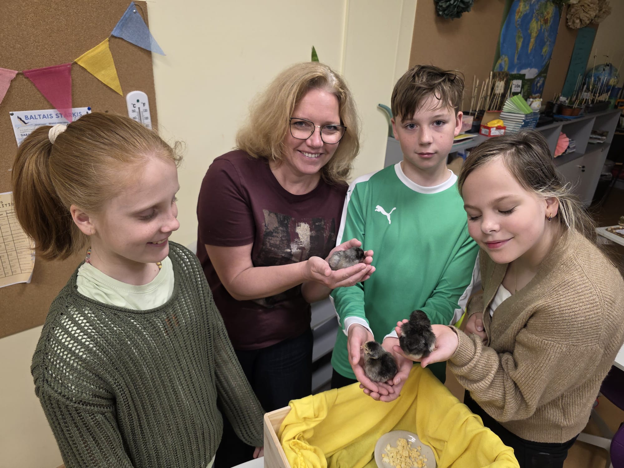 Mums izšķīlās 15 mīksti, mīlīgi un pūkaini draudziņi. Mūsu cāļus apciemot nāca tiešām visa skola.