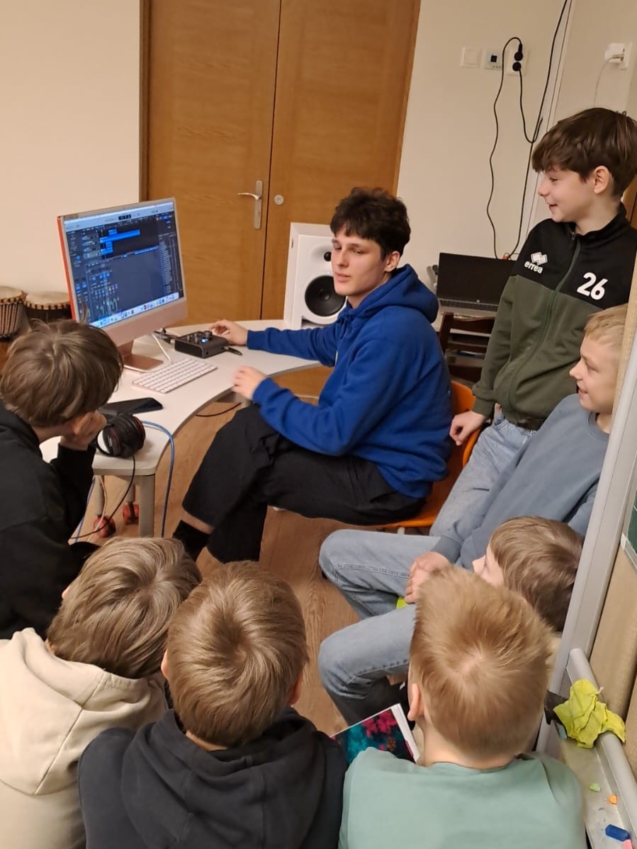 🎹 Nodarbības laikā skolēni iepazinās ar digitālās mūzikas rīkiem – DAW, skaņas kartēm, MIDI kontrolieriem, eksperimentēja ar audio efektiem, sintezatoriem un praktiski radīja savu mūziku.